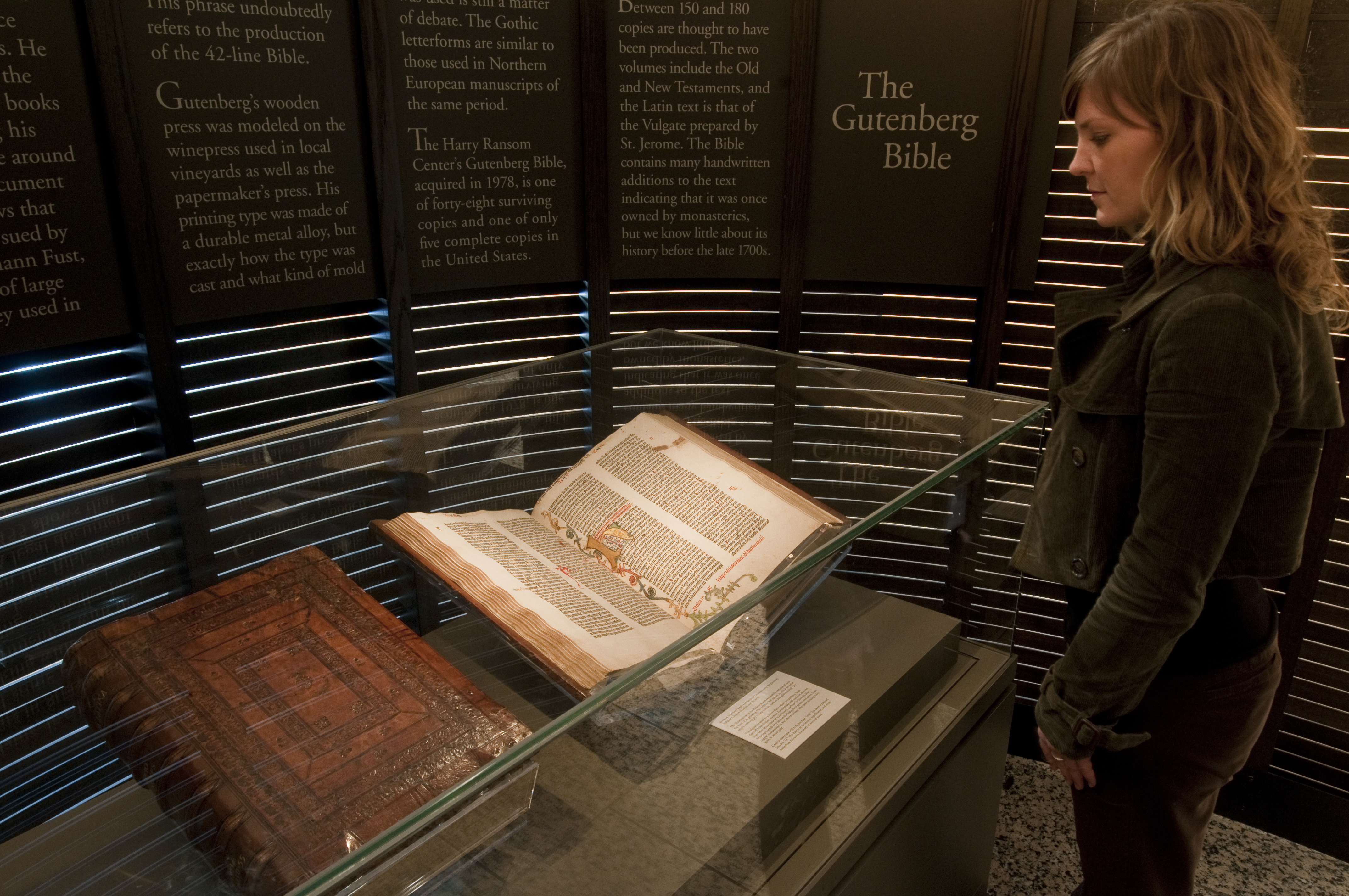 Biblia latina (Mainz, Germany: Johann Gutenberg and Johann Fust, between 1454 and 1456). Harry Ransom Center. Photo Courtesy TxDOT/Stan A. Williams.
